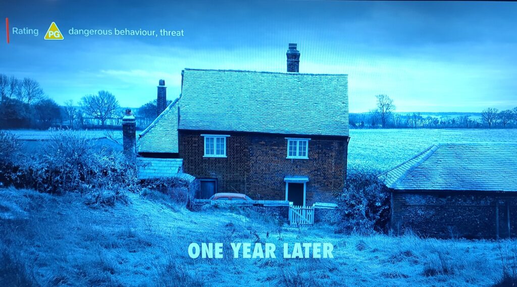 Although the redbrick farmhouse at Blossom Farm didn’t instantly match the  brief on front view, we knew that it would from the back angle in the fields (see photo above and below, taken from Episode 1 of the show on Netflix below). The production removed some of the stables and barns away in post edit but otherwise it was left as is, with the back door becoming the front door for this particular cottage look.