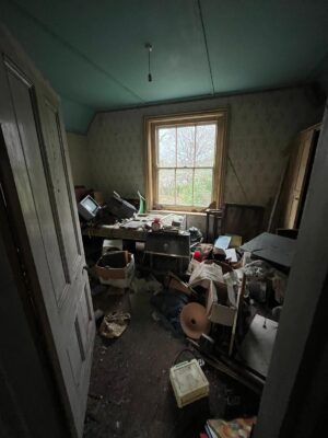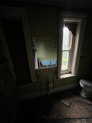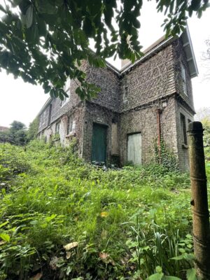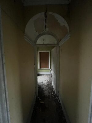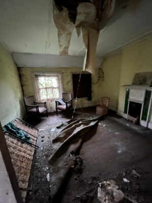 • Georgian manor house in disrepair, offering a selection of internal rooms of varying conditions, including a large basement with multiple spaces and tunnel-like corridors